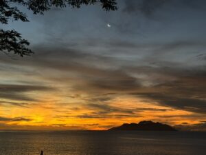 太陽が静かに海へ沈んでいき、月も見えてきました。